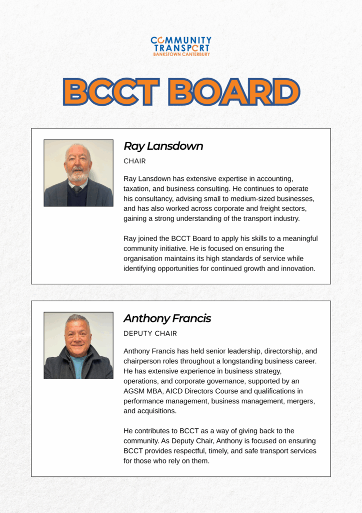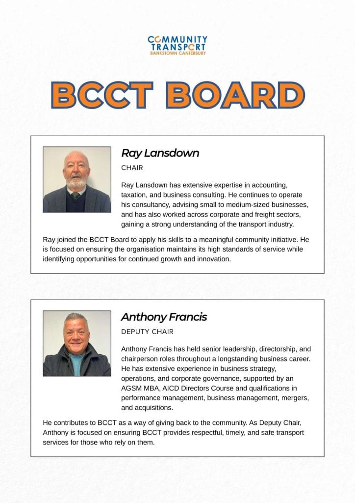 Bankstown Canterbury Community Transport (BCCT) provides affordable and accessible transport to Canterbury Bankstown Local Government Area residents. We are a not-for-profit organisation that supports community members who have specific transport needs related to their age, frailty, permanent disability or temporary physical impairment.
